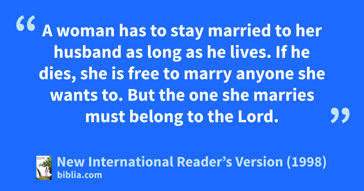 39A woman has to stay married to her husband as long as he lives. If he dies, she is free to marry anyone she wants to. But the one she marries must belong to the Lord. 40In my opinion, she is happier if she stays single. And I also think that I am led by the Spirit of God in saying that.
