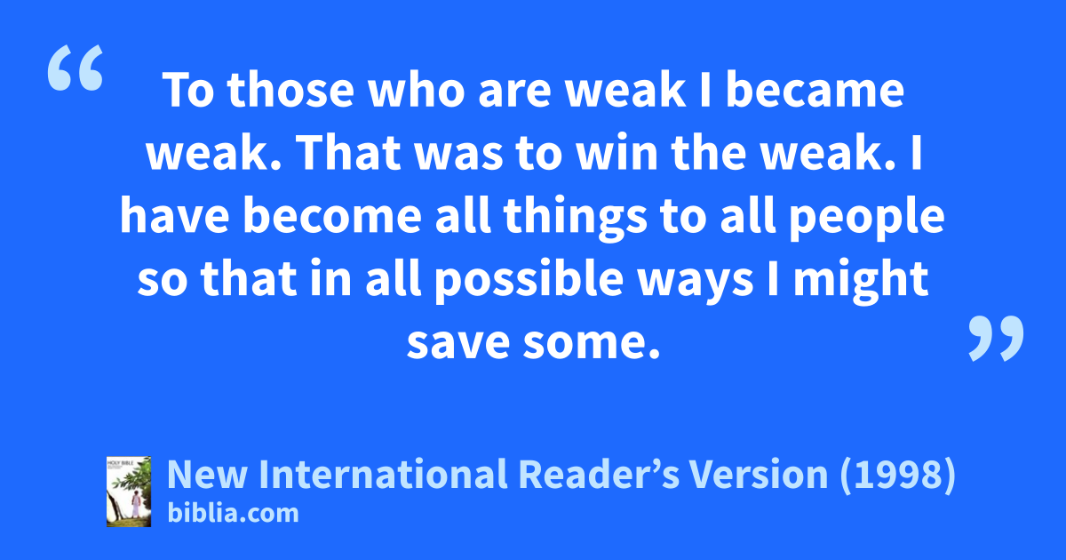 20To the Jews I became like a Jew. That was to win the Jews. To those under the law I became like one who was under the law, even though I myself am not under the law. That was to win those under the law. 21To those who don’t have the law I became like one who doesn’t have the law. I am not free from God’s law. I am under Christ’s law. Now I can win those who don’t have the law. 22To those who are weak I became weak. That was to win the weak.