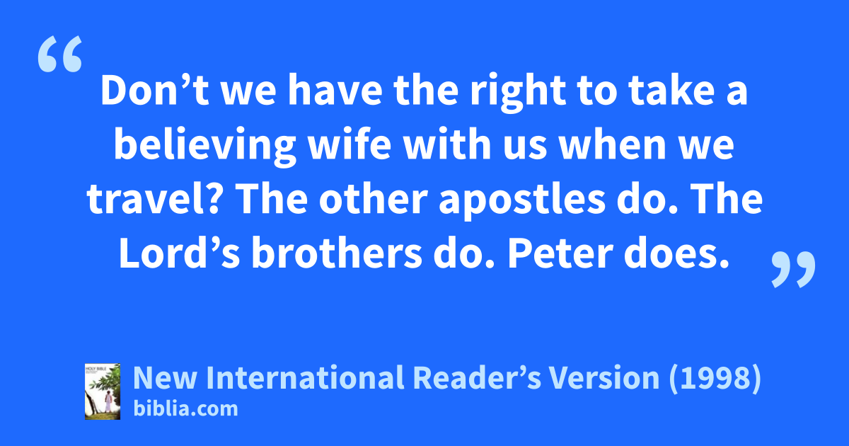 4Don’t we have the right to eat and drink? 5Don’t we have the right to take a believing wife with us when we travel? The other apostles do. The Lord’s brothers do. Peter does. 6Or are Barnabas and I the only ones who have to work for a living?