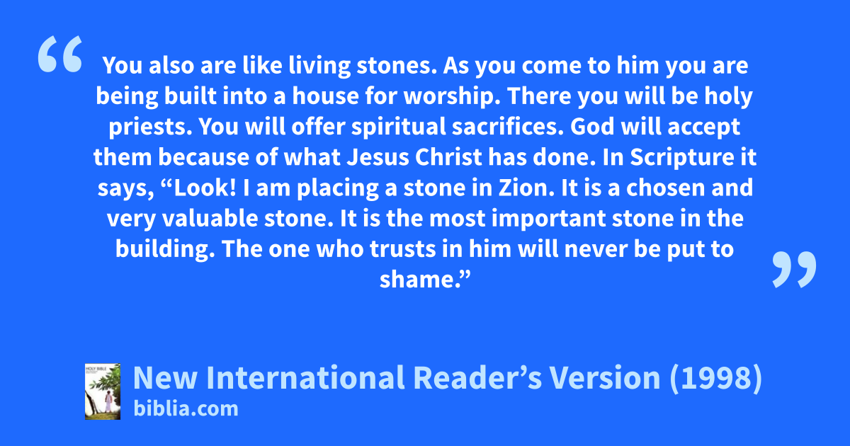 5You also are like living stones. As you come to him you are being built into a house for worship. There you will be holy priests. You will offer spiritual sacrifices. God will accept them because of what Jesus Christ has done.