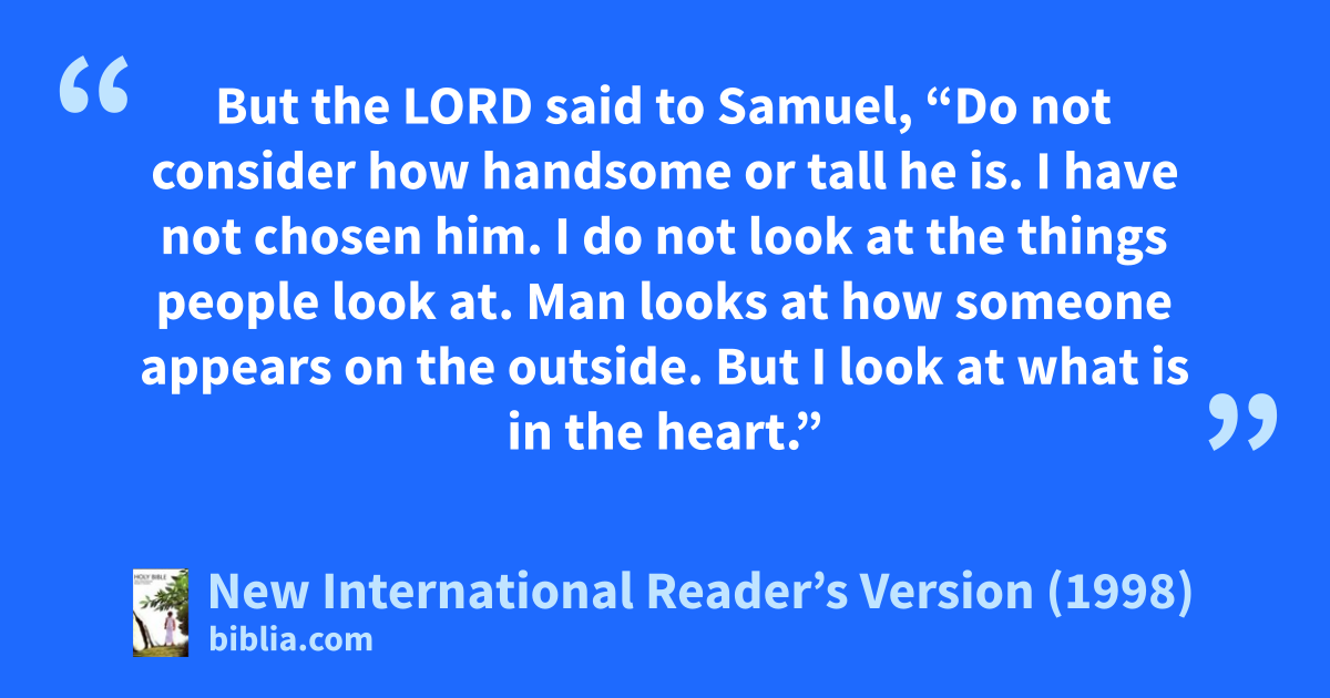 7But the Lord said to Samuel, “Do not consider how handsome or tall he is. I have not chosen him. I do not look at the things people look at. Man looks at how someone appears on the outside. But I look at what is in the heart.”