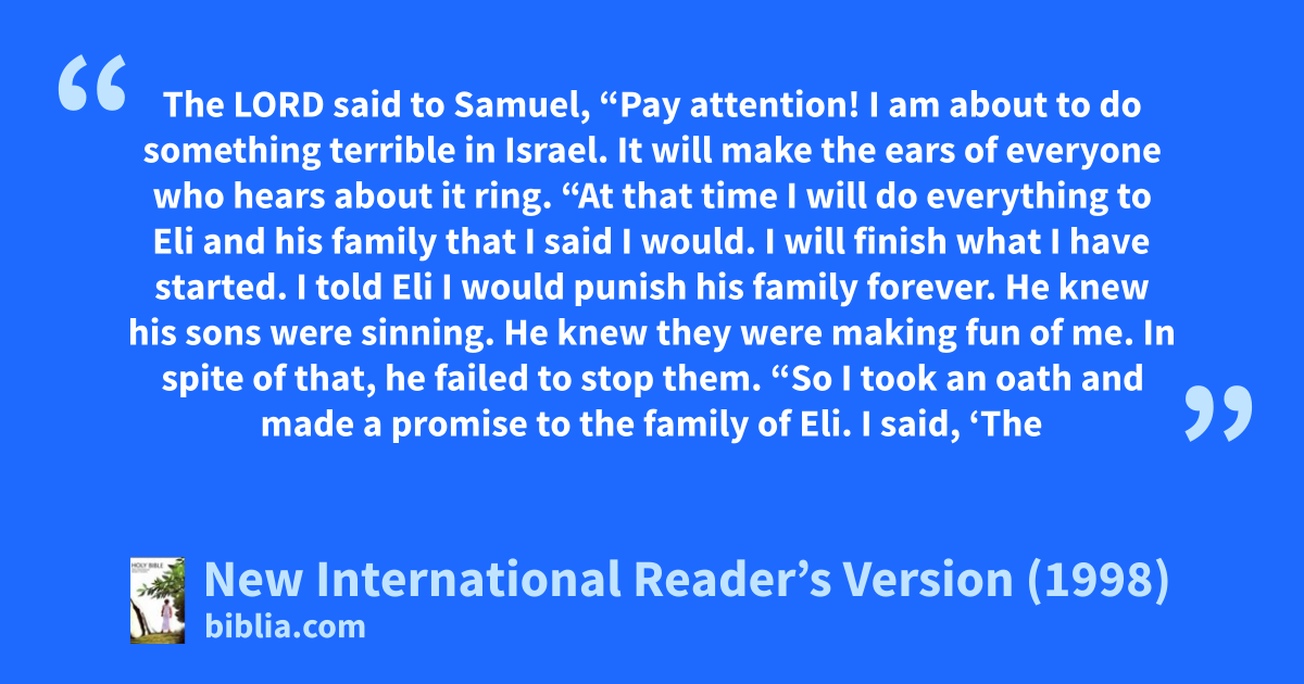 14“So I took an oath and made a promise to the family of Eli. I said, ‘The sins of Eli’s family will never be paid for by bringing sacrifices or offerings.’ ”
