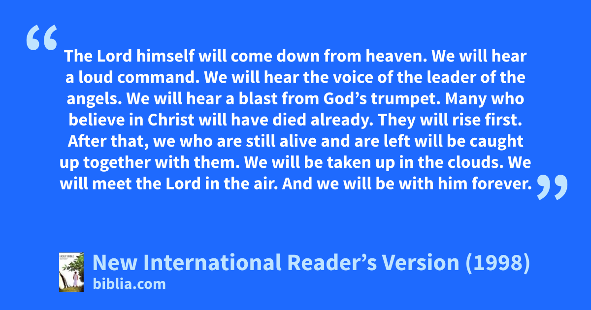 16The Lord himself will come down from heaven. We will hear a loud command. We will hear the voice of the leader of the angels. We will hear a blast from God’s trumpet. Many who believe in Christ will have died already. They will rise first. 17After that, we who are still alive and are left will be caught up together with them. We will be taken up in the clouds. We will meet the Lord in the air. And we will be with him forever.