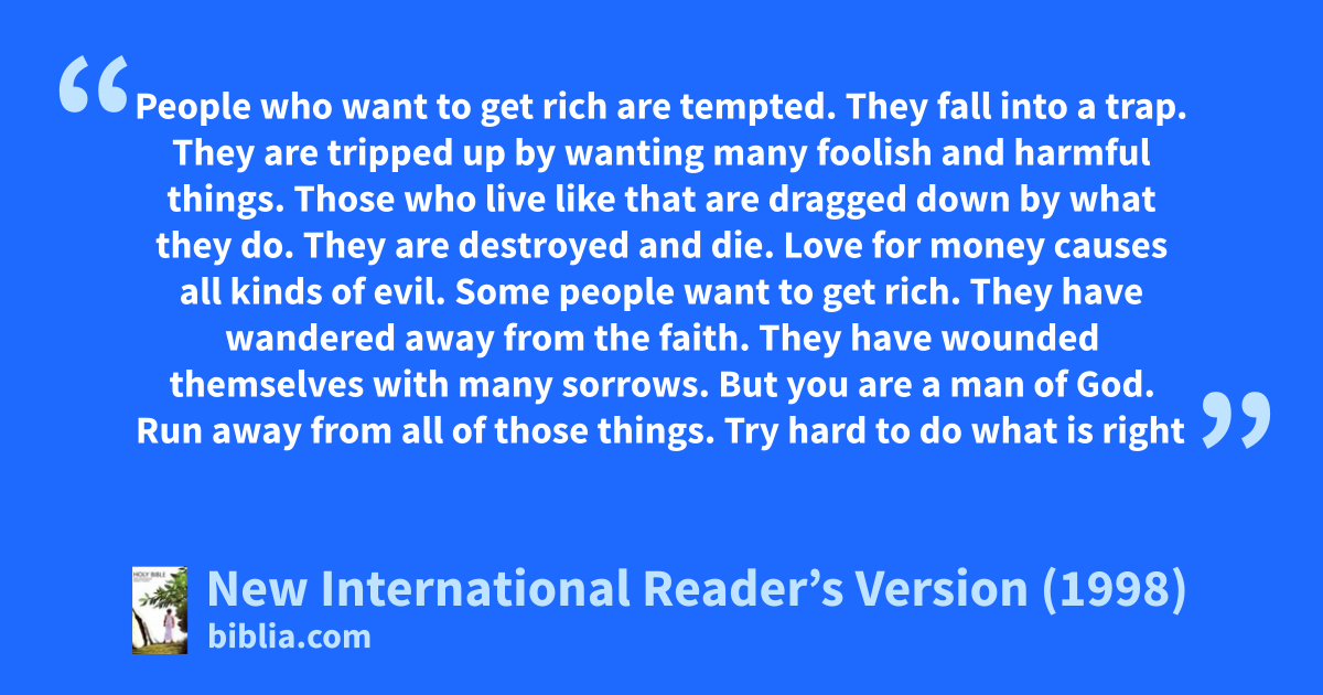 10Love for money causes all kinds of evil. Some people want to get rich. They have wandered away from the faith. They have wounded themselves with many sorrows.