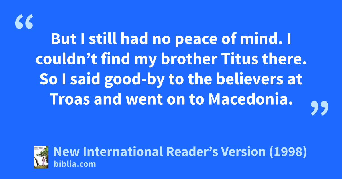 12I went to Troas to preach the good news about Christ. There I found that the Lord had opened a door of opportunity for me. 13But I still had no peace of mind. I couldn’t find my brother Titus there. So I said good-by to the believers at Troas and went on to Macedonia.