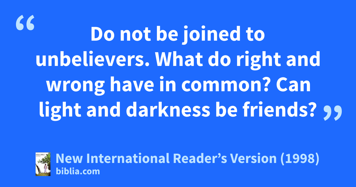 14Do not be joined to unbelievers. What do right and wrong have in common? Can light and darkness be friends? 15How can Christ and Satan agree? What does a believer have in common with an unbeliever? 16How can the temple of the true God and the statues of other gods agree?