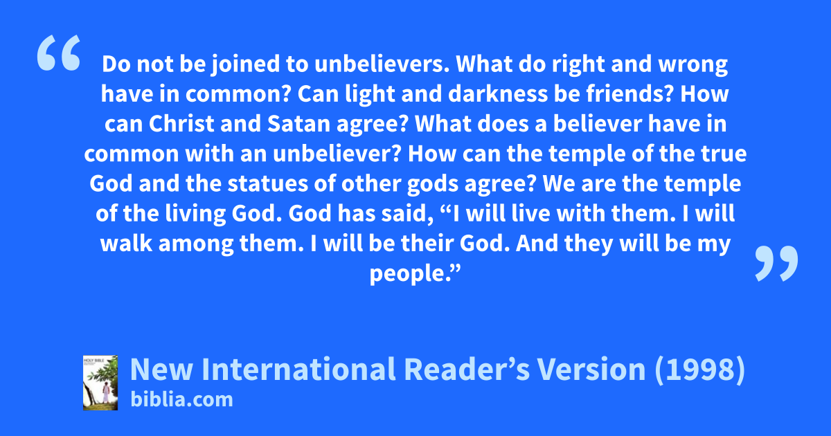 14Do not be joined to unbelievers. What do right and wrong have in common? Can light and darkness be friends? 15How can Christ and Satan agree? What does a believer have in common with an unbeliever? 16How can the temple of the true God and the statues of other gods agree?