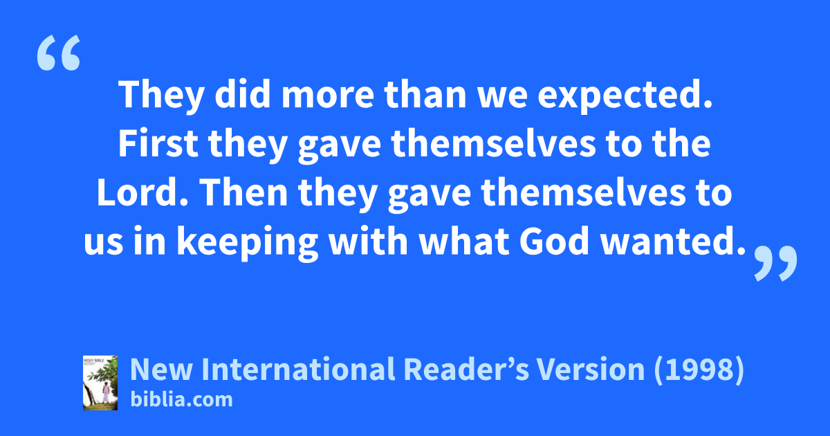 3I give witness that they gave as much as they could. In fact, they gave even more than they could. Completely on their own, 4they begged us for the chance to share in serving God’s people in that way. 5They did more than we expected. First they gave themselves to the Lord. Then they gave themselves to us in keeping with what God wanted.