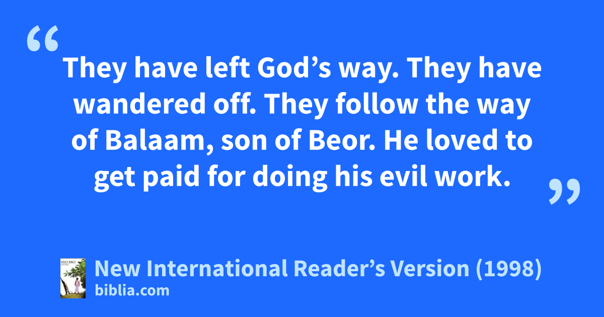 15They have left God’s way. They have wandered off. They follow the way of Balaam, son of Beor. He loved to get paid for doing his evil work. 16But a donkey corrected him for the wrong he did. Animals don’t speak. But the donkey spoke with a human voice. It tried to stop the prophet from doing a very dumb thing.