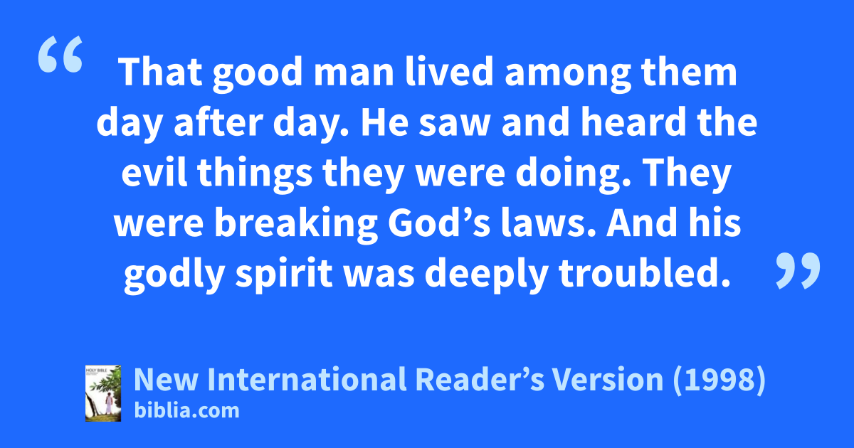 7God saved Lot. He was a man who did what was right. He was shocked by the dirty, sinful lives of people who didn’t obey God’s laws. 8That good man lived among them day after day. He saw and heard the evil things they were doing. They were breaking God’s laws. And his godly spirit was deeply troubled.