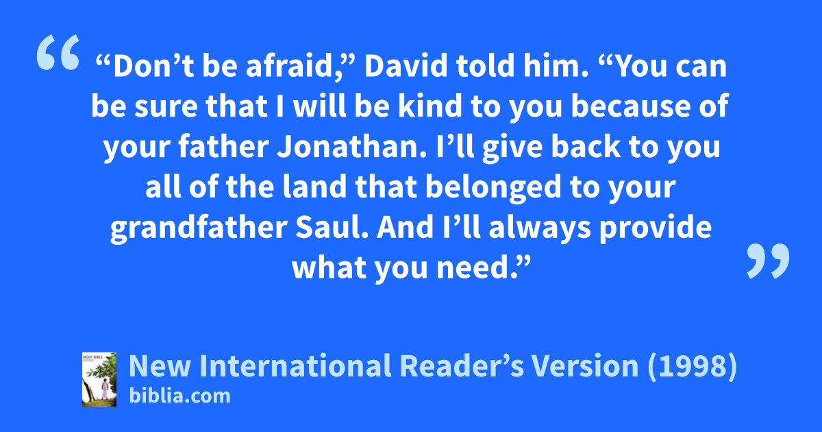 7“Don’t be afraid,” David told him. “You can be sure that I will be kind to you because of your father Jonathan. I’ll give back to you all of the land that belonged to your grandfather Saul. And I’ll always provide what you need.”