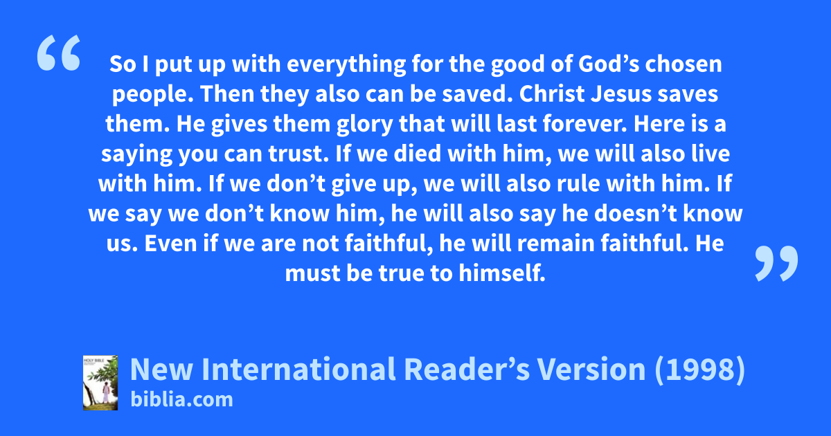 10So I put up with everything for the good of God’s chosen people. Then they also can be saved. Christ Jesus saves them. He gives them glory that will last forever.