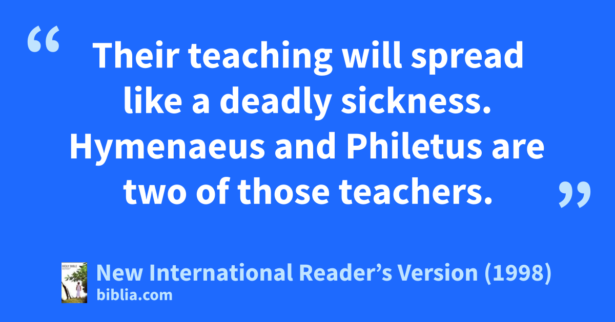 Hymenaeus and Philetus are two of those teachers. 18They have wandered away from the truth. They say that the time when people will rise from the dead has already come. They destroy the faith of some people.
