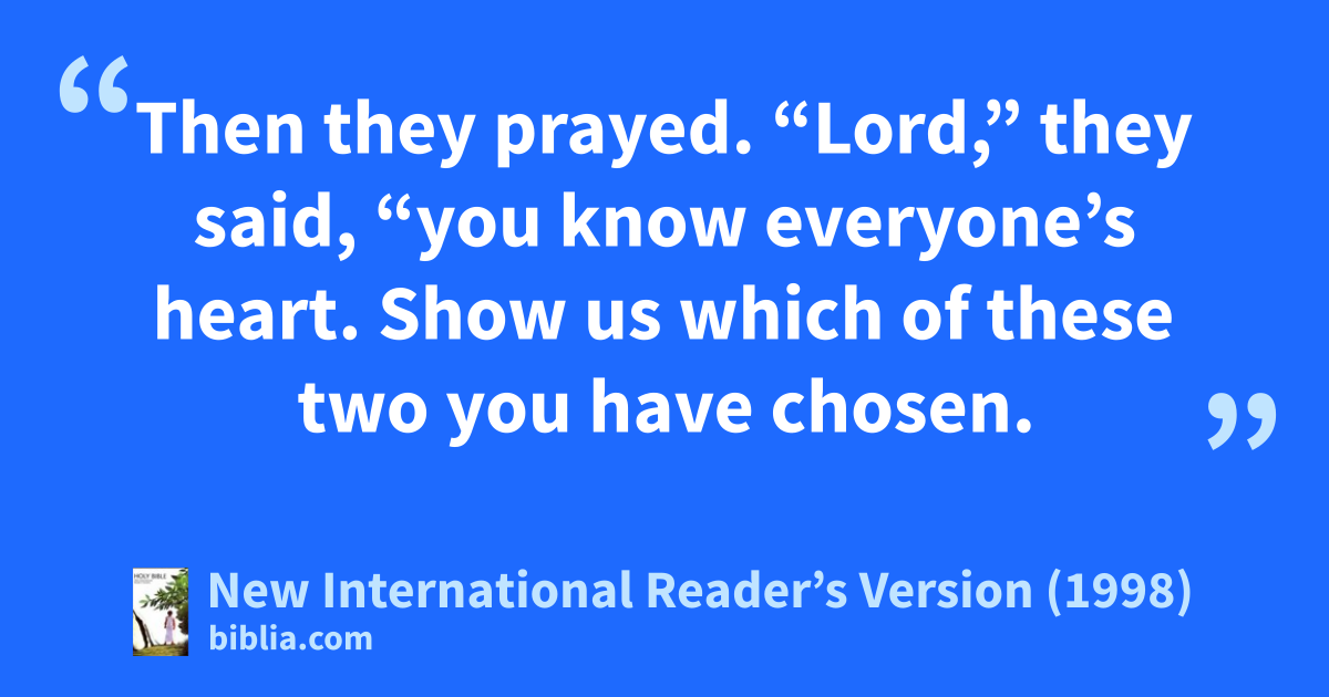 23So they suggested two men. One was Joseph, who was called Barsabbas. He was also called Justus. The other man was Matthias. 24Then they prayed. “Lord,” they said, “you know everyone’s heart. Show us which of these two you have chosen. 25Show us who should take the place of Judas as an apostle. He gave up being an apostle to go where he belongs.” 26Then they cast lots. Matthias was chosen. So he was added to the 11 apostles.
