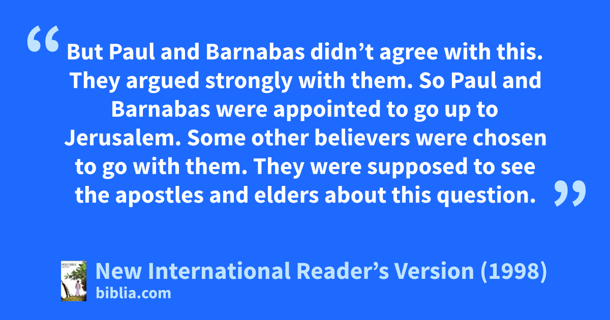 15 Certain people came down from Judea to Antioch. Here is what they were teaching the believers. “Moses commanded you to be circumcised,” they said. “If you aren’t, you can’t be saved.” 2But Paul and Barnabas didn’t agree with this. They argued strongly with them. So Paul and Barnabas were appointed to go up to Jerusalem. Some other believers were chosen to go with them. They were supposed to see the apostles and elders about this question.