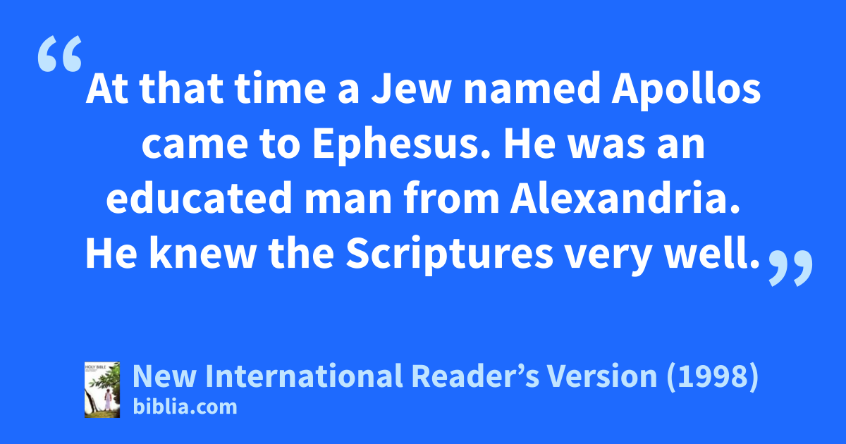 24At that time a Jew named Apollos came to Ephesus. He was an educated man from Alexandria. He knew the Scriptures very well. 25Apollos had been taught the way of the Lord. He spoke with great power. He taught the truth about Jesus. But he only knew about John’s baptism. 26He began to speak boldly in the synagogue. Priscilla and Aquila heard him. So they invited him to their home. There they gave him a better understanding of the way of God.