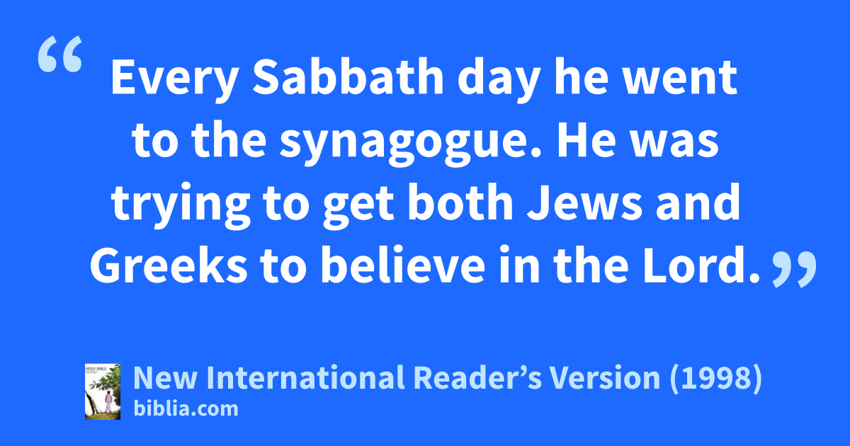 18 After this, Paul left Athens and went to Corinth. 2There he met a Jew named Aquila, who was a native of Pontus. Aquila had recently come from Italy with his wife Priscilla. The emperor Claudius had ordered all the Jews to leave Rome. Paul went to see Aquila and Priscilla. 3They were tentmakers, just as he was. So he stayed and worked with them. 4Every Sabbath day he went to the synagogue. He was trying to get both Jews and Greeks to believe in the Lord.