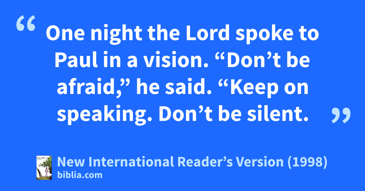 9One night the Lord spoke to Paul in a vision. “Don’t be afraid,” he said. “Keep on speaking. Don’t be silent. 10I am with you. No one will attack you and harm you. I have many people in this city.” 11So Paul stayed there for a year and a half. He taught them God’s word.