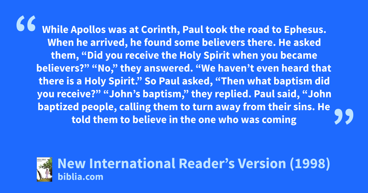 19 While Apollos was at Corinth, Paul took the road to Ephesus. When he arrived, he found some believers there. 2He asked them, “Did you receive the Holy Spirit when you became believers?”