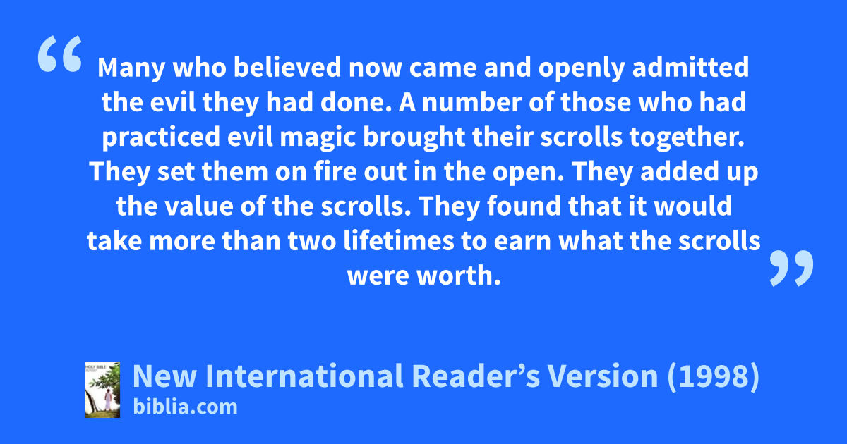 17The Jews and Greeks living in Ephesus heard about this. They were all overcome with fear. They held the name of the Lord Jesus in high honor. 18Many who believed now came and openly admitted the evil they had done. 19A number of those who had practiced evil magic brought their scrolls together. They set them on fire out in the open. They added up the value of the scrolls. They found that it would take more than two lifetimes to earn what the scrolls were worth.
