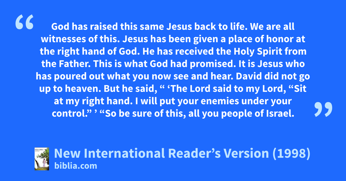 29“Brothers, you can be sure that King David died. He was buried. His tomb is still here today. 30But David was a prophet. He knew that God had made a promise to him. He had taken an oath that someone in David’s family line would be king after him. 31David saw what was ahead. So he spoke about the Christ rising from the dead. He said that the Christ would not be left in the grave. His body wouldn’t rot in the ground. 32God has raised this same Jesus back to life. We are all witnesses of this. 33Jesus has been given a place of honor at the right hand of God. He has received the Holy Spirit from the Father. This is what God had promised. It is Jesus who has poured out what you now see and hear. 34David did not go up to heaven. But he said,