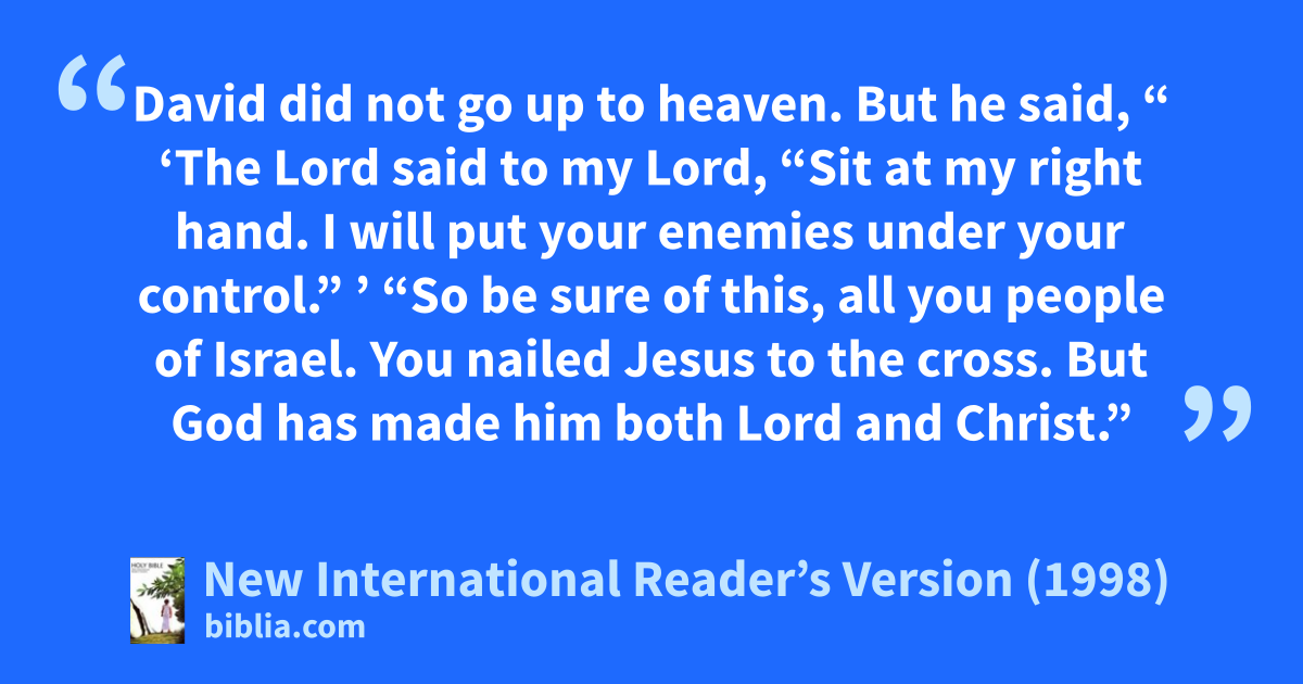 29“Brothers, you can be sure that King David died. He was buried. His tomb is still here today. 30But David was a prophet. He knew that God had made a promise to him. He had taken an oath that someone in David’s family line would be king after him. 31David saw what was ahead. So he spoke about the Christ rising from the dead. He said that the Christ would not be left in the grave. His body wouldn’t rot in the ground. 32God has raised this same Jesus back to life. We are all witnesses of this. 33Jesus has been given a place of honor at the right hand of God. He has received the Holy Spirit from the Father. This is what God had promised. It is Jesus who has poured out what you now see and hear. 34David did not go up to heaven. But he said,