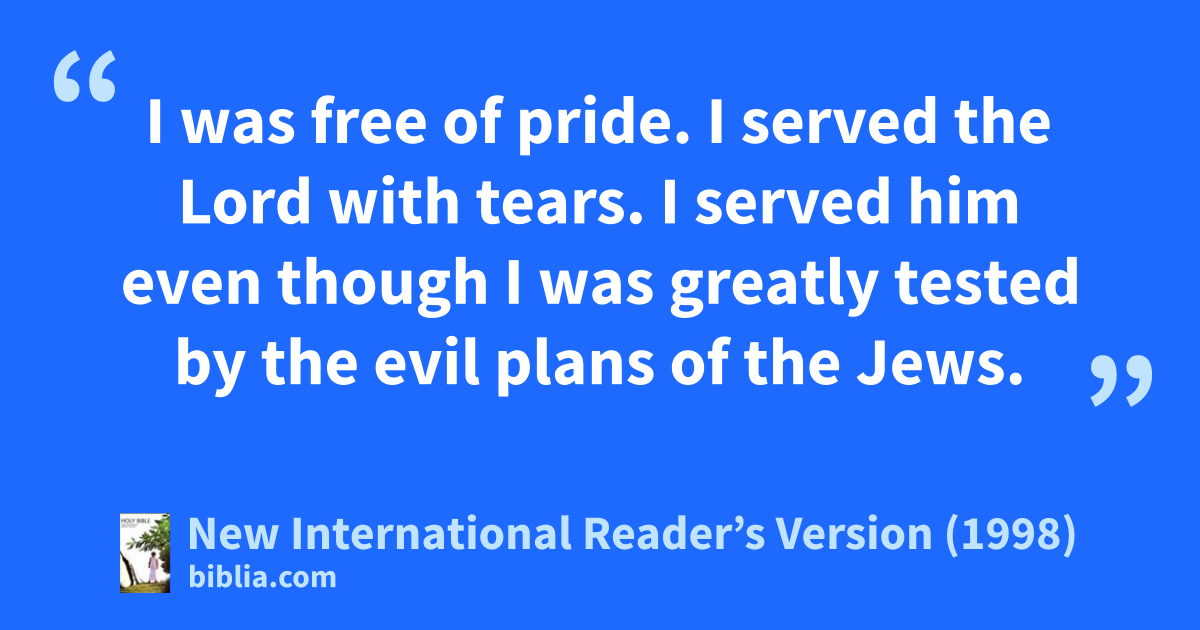 17From Miletus, Paul sent for the elders of the church at Ephesus. 18When they arrived, he spoke to them. “You know how I lived the whole time I was with you,” he said. “From the first day I came into Asia Minor, 19I was free of pride. I served the Lord with tears. I served him even though I was greatly tested by the evil plans of the Jews. 20You know I haven’t let anyone keep me from preaching anything that would be helpful to you. I have taught you in public and from house to house. 21I have told both Jews and Greeks that they must turn away from their sins to God. They must have faith in our Lord Jesus.