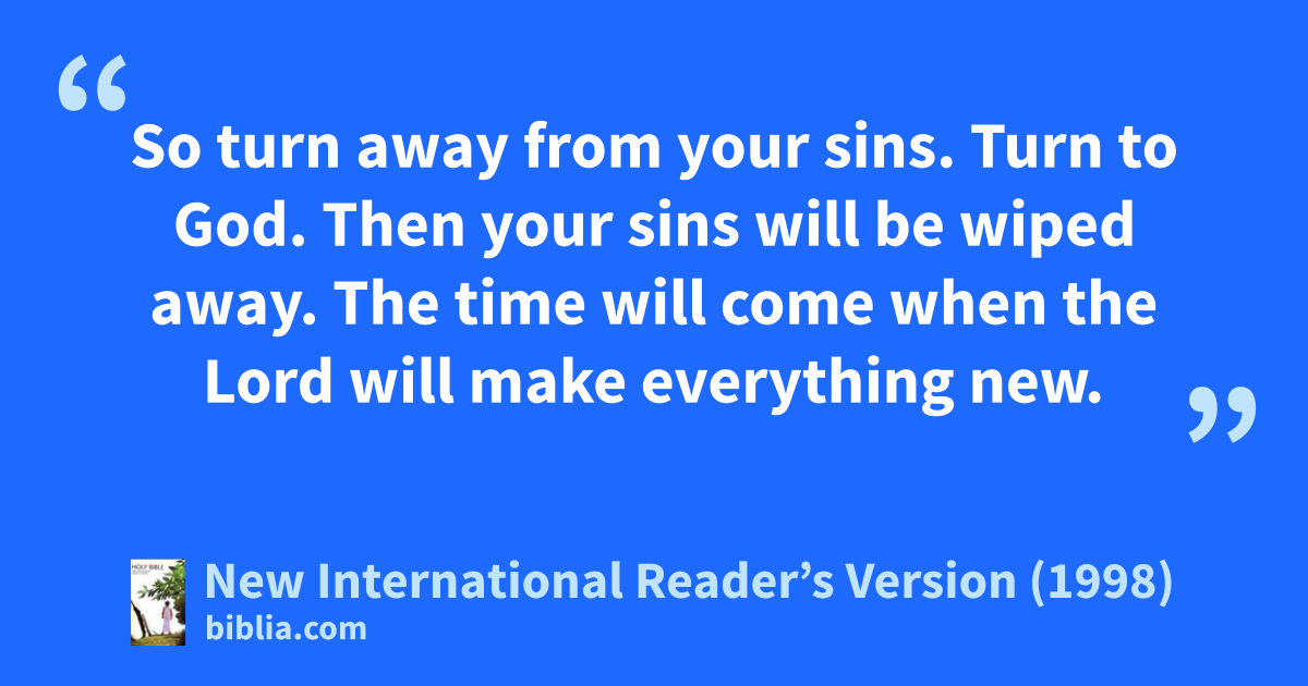 17“My friends, I know you didn’t realize what you were doing. Neither did your leaders. 18But God had given a promise through all the prophets. And this is how he has made his promise come true. He said that his Christ would suffer. 19So turn away from your sins. Turn to God. Then your sins will be wiped away. The time will come when the Lord will make everything new. 20He will send the Christ. Jesus has been appointed as the Christ for you. 21He must remain in heaven until the time when God makes everything new. He promised this long ago through his holy prophets. 22Moses said, ‘The Lord your God will raise up for you a prophet like me. He will be one of your own people. You must listen to everything he tells you. 23Those who do not listen to him will be completely cut off from their people.’ (Deuteronomy 18:15, 18, 19)