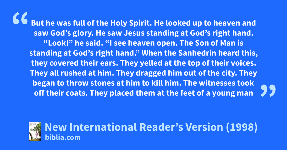 54When the Sanhedrin heard this, they became very angry. They ground their teeth at Stephen. 55But he was full of the Holy Spirit. He looked up to heaven and saw God’s glory. He saw Jesus standing at God’s right hand. 56“Look!” he said. “I see heaven open. The Son of Man is standing at God’s right hand.”