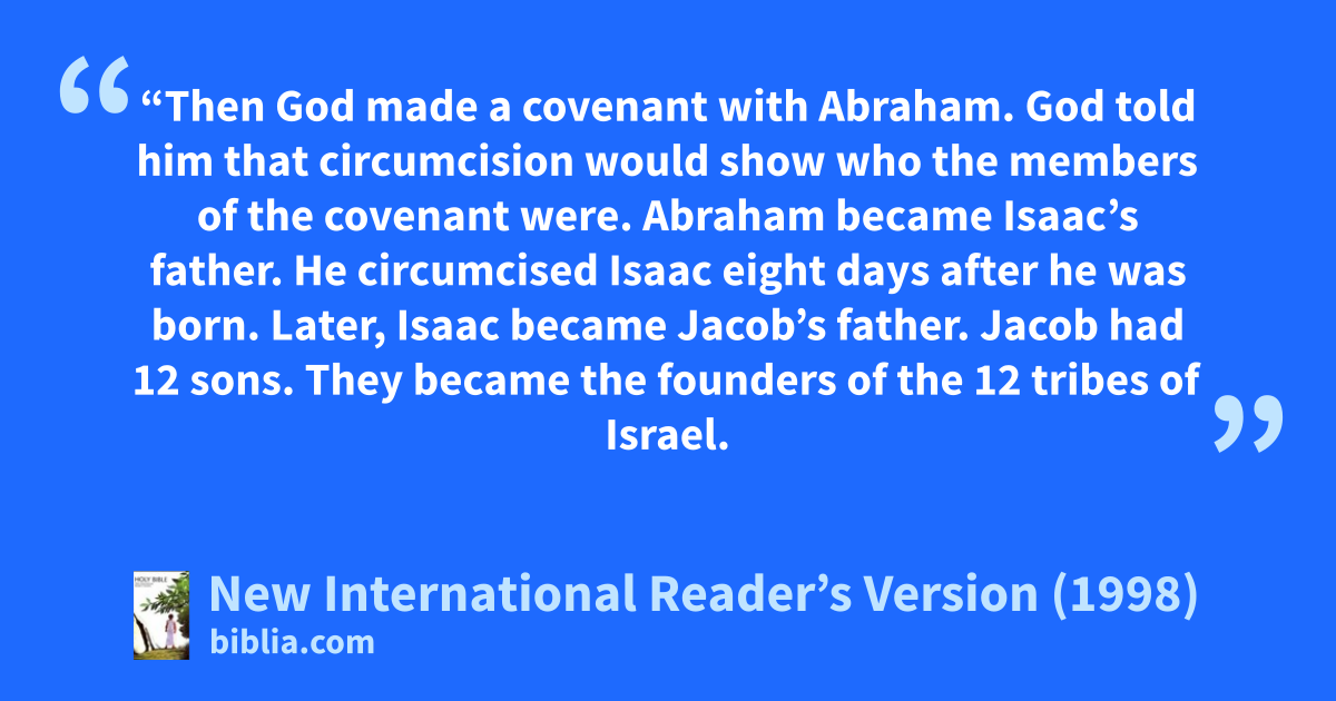 8“Then God made a covenant with Abraham. God told him that circumcision would show who the members of the covenant were. Abraham became Isaac’s father. He circumcised Isaac eight days after he was born. Later, Isaac became Jacob’s father. Jacob had 12 sons. They became the founders of the 12 tribes of Israel.