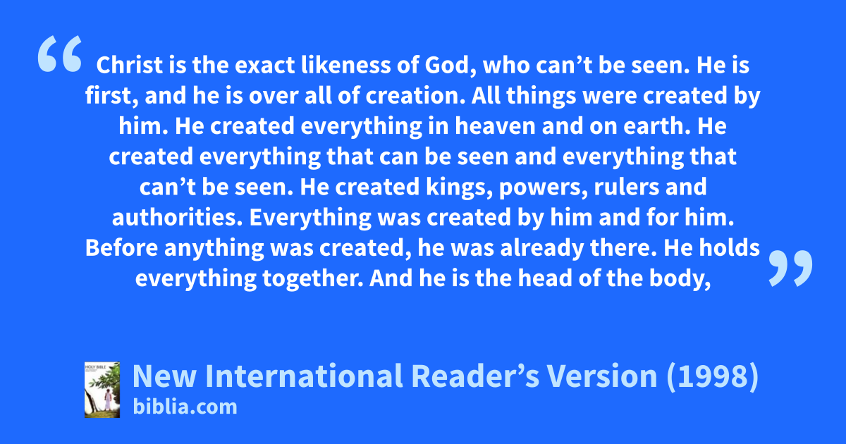 15Christ is the exact likeness of God, who can’t be seen. He is first, and he is over all of creation. 16All things were created by him. He created everything in heaven and on earth. He created everything that can be seen and everything that can’t be seen. He created kings, powers, rulers and authorities. Everything was created by him and for him. 17Before anything was created, he was already there. He holds everything together.
