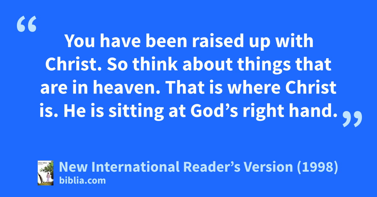 3 You have been raised up with Christ. So think about things that are in heaven. That is where Christ is. He is sitting at God’s right hand. 2Think about things that are in heaven. Don’t think about things that are on earth.