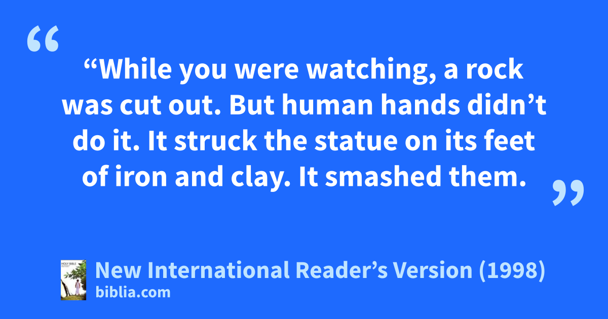 44“In the time of those kings, the God of heaven will set up a kingdom. It will never be destroyed. And no other nation will ever take it over. It will crush all of those other kingdoms. It will bring them to an end. But it will last forever. 45That’s what the vision of the rock cut out of a mountain means. Human hands didn’t cut the rock out. It broke the statue to pieces. It smashed the iron, bronze, clay, silver and gold.