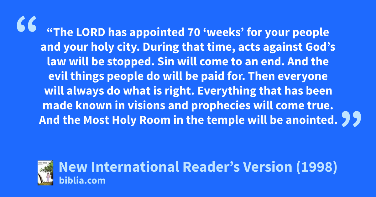 24“The Lord has appointed 70 ‘weeks’ for your people and your holy city. During that time, acts against God’s law will be stopped. Sin will come to an end. And the evil things people do will be paid for. Then everyone will always do what is right. Everything that has been made known in visions and prophecies will come true. And the Most Holy Room in the temple will be anointed.