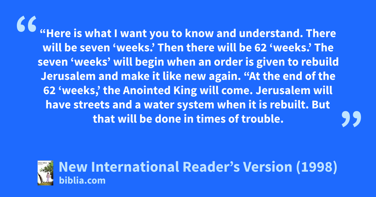 25“Here is what I want you to know and understand. There will be seven ‘weeks.’ Then there will be 62 ‘weeks.’ The seven ‘weeks’ will begin when an order is given to rebuild Jerusalem and make it like new again.