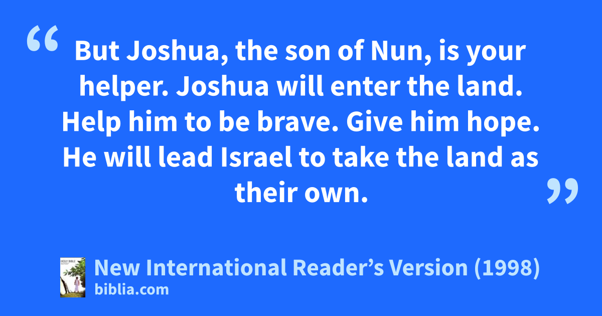 37Because of you, the Lord became angry with me also. He said, “You will not enter the land either. 38But Joshua, the son of Nun, is your helper. Joshua will enter the land. Help him to be brave. Give him hope. He will lead Israel to take the land as their own.