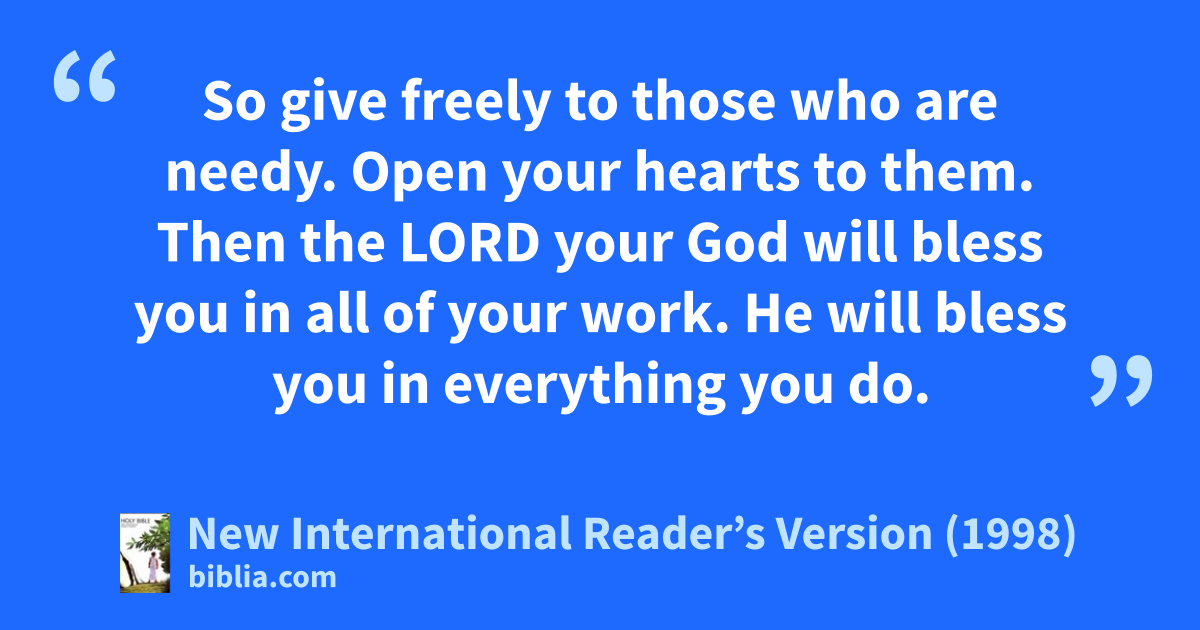 10So give freely to those who are needy. Open your hearts to them. Then the Lord your God will bless you in all of your work. He will bless you in everything you do. 11There will always be poor people in the land. So I’m commanding you to give freely to those who are poor and needy in your land. Open your hands to them.