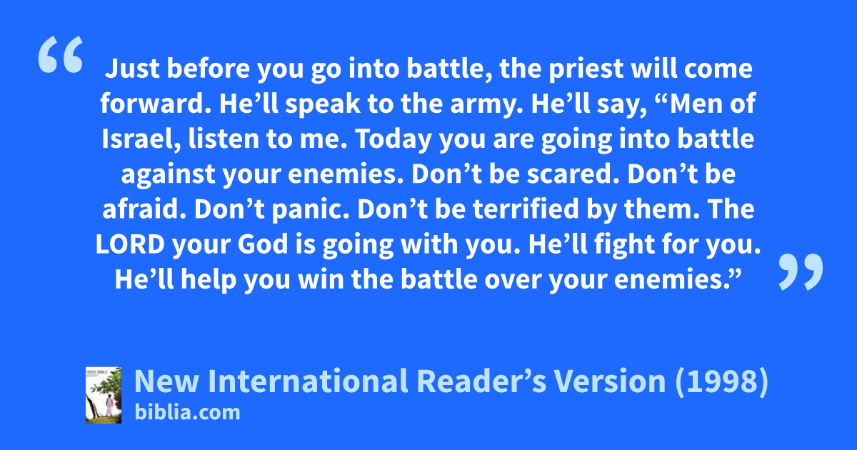 2Just before you go into battle, the priest will come forward. He’ll speak to the army. 3He’ll say, “Men of Israel, listen to me. Today you are going into battle against your enemies. Don’t be scared. Don’t be afraid. Don’t panic. Don’t be terrified by them. 4The Lord your God is going with you. He’ll fight for you. He’ll help you win the battle over your enemies.”