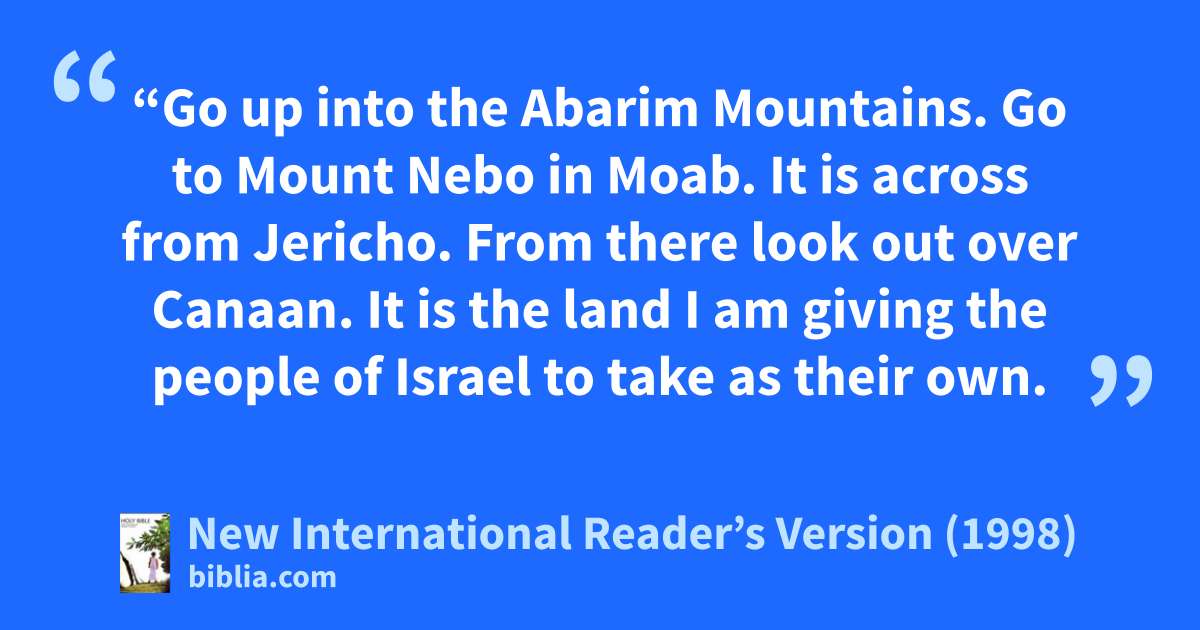 48On that same day the Lord spoke to me. He said, 49“Go up into the Abarim Mountains. Go to Mount Nebo in Moab. It is across from Jericho. From there look out over Canaan. It is the land I am giving the people of Israel to take as their own.