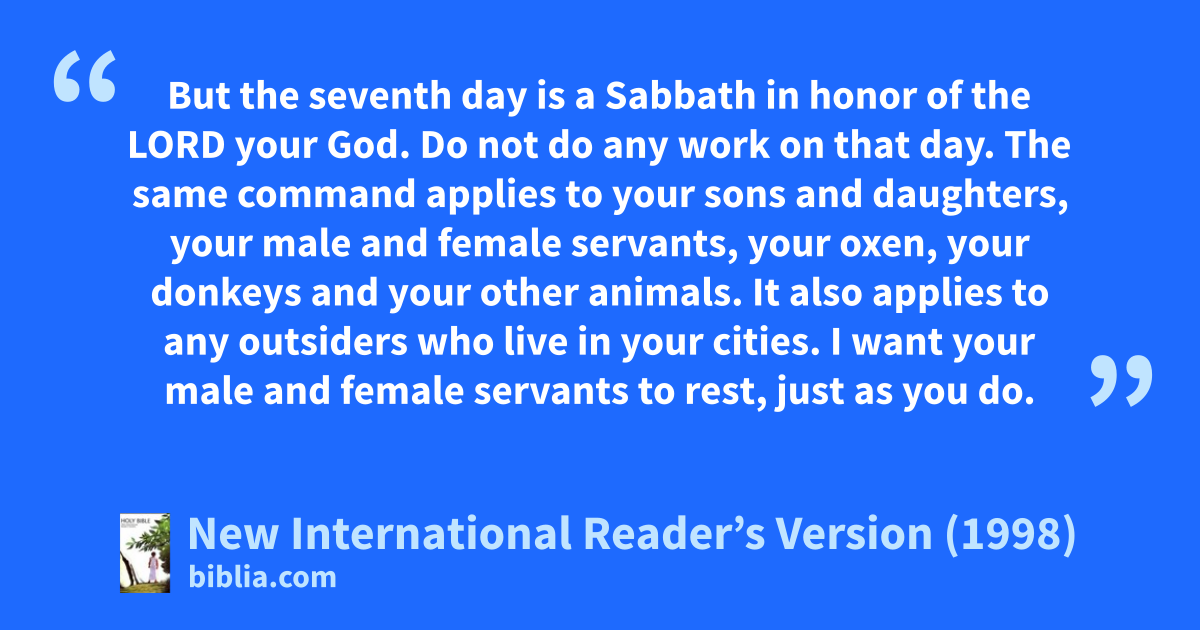 12 “Observe the Sabbath day. Keep it holy, just as the Lord your God commanded you. 13Do all of your work in six days. 14But the seventh day is a Sabbath in honor of the Lord your God. Do not do any work on that day. The same command applies to your sons and daughters, your male and female servants, your oxen, your donkeys and your other animals. It also applies to any outsiders who live in your cities. I want your male and female servants to rest, just as you do. 15Remember that you were slaves in Egypt. The Lord your God reached out his mighty hand and powerful arm and brought you out of there. So he has commanded you to observe the Sabbath day.