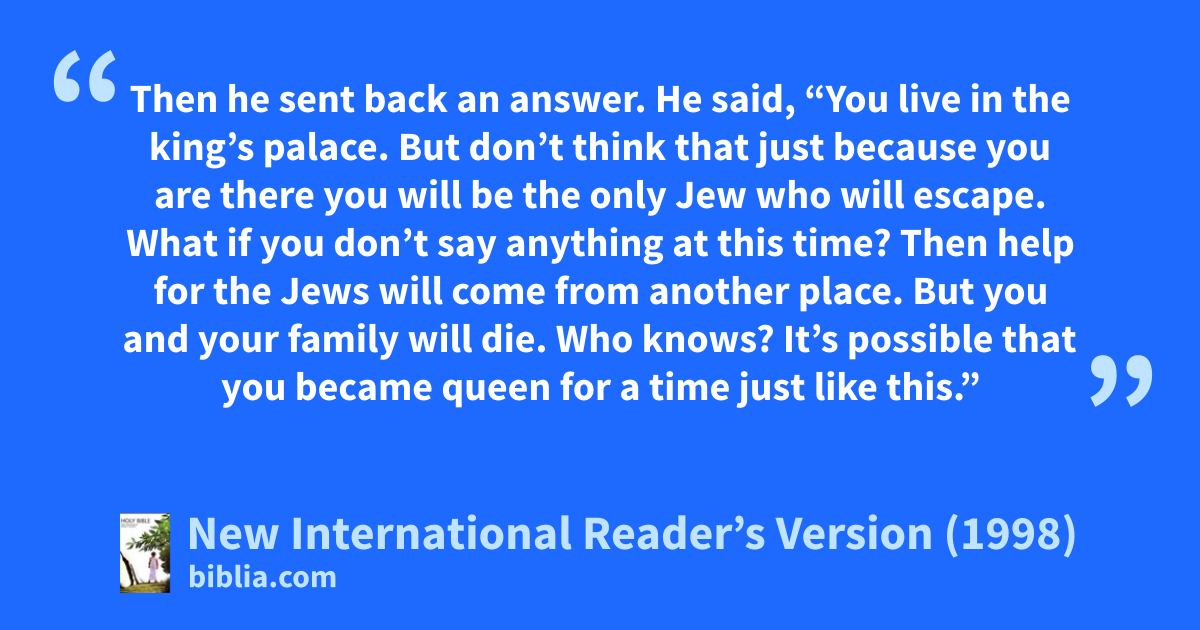 12Esther’s words were reported to Mordecai. 13Then he sent back an answer. He said, “You live in the king’s palace. But don’t think that just because you are there you will be the only Jew who will escape. 14What if you don’t say anything at this time? Then help for the Jews will come from another place. But you and your family will die. Who knows? It’s possible that you became queen for a time just like this.”