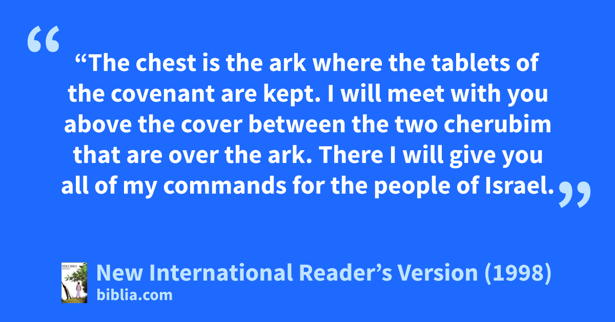 22“The chest is the ark where the tablets of the covenant are kept. I will meet with you above the cover between the two cherubim that are over the ark. There I will give you all of my commands for the people of Israel.