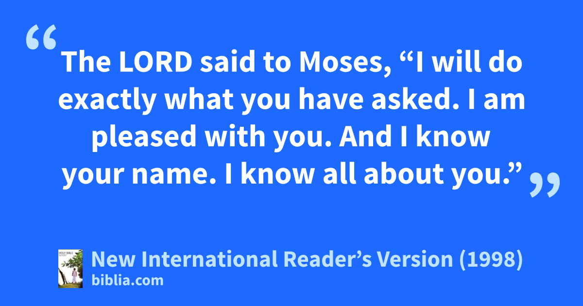 17The Lord said to Moses, “I will do exactly what you have asked. I am pleased with you. And I know your name. I know all about you.”