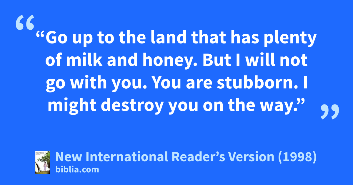 3“Go up to the land that has plenty of milk and honey. But I will not go with you. You are stubborn. I might destroy you on the way.”