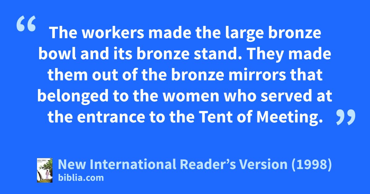 8The workers made the large bronze bowl and its bronze stand. They made them out of the bronze mirrors that belonged to the women who served at the entrance to the Tent of Meeting.