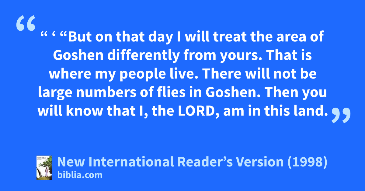22“ ‘ “But on that day I will treat the area of Goshen differently from yours. That is where my people live. There will not be large numbers of flies in Goshen. Then you will know that I, the Lord, am in this land. 23I will treat my people differently from yours. The miraculous sign will take place tomorrow.” ’ ”