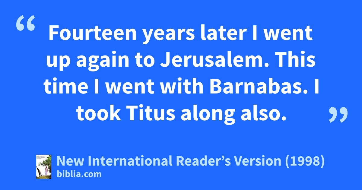 2 Fourteen years later I went up again to Jerusalem. This time I went with Barnabas. I took Titus along also. 2I went because God showed me what he wanted me to do. I told the people there the good news that I preach among those who aren’t Jews. But I spoke in private to those who seemed to be leaders. I was afraid that I was running or had run my race for nothing.