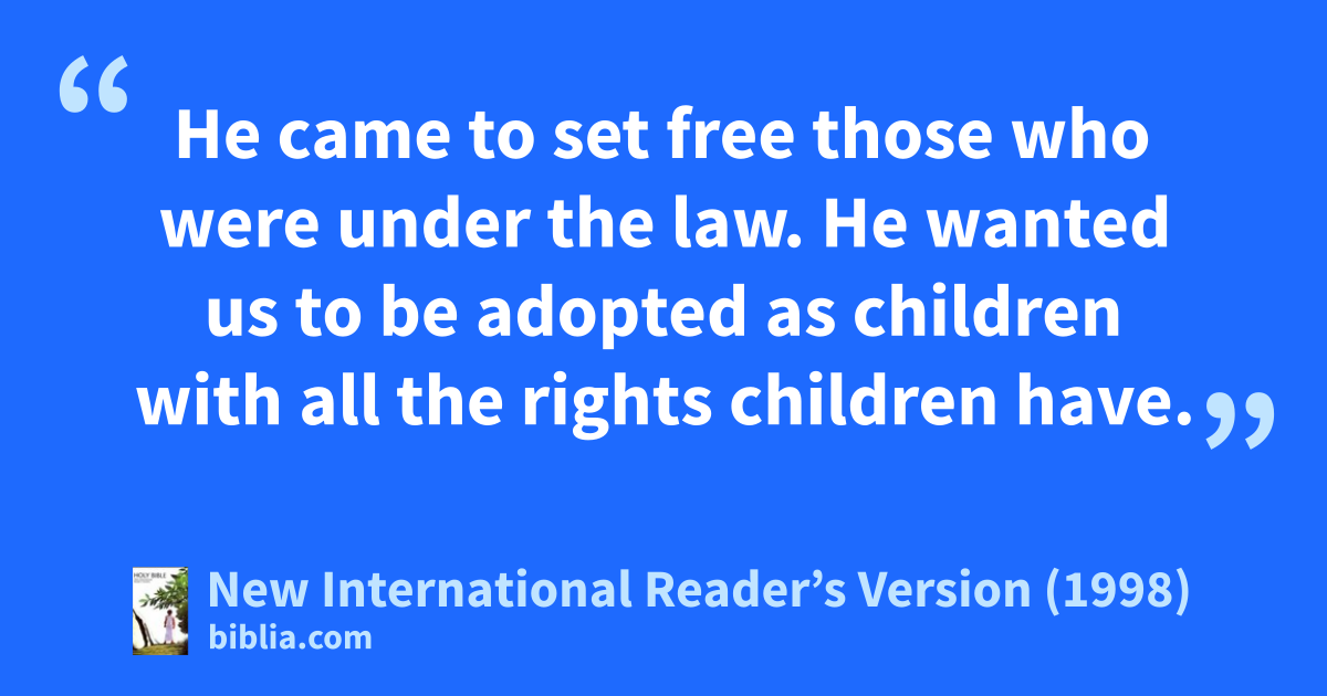 4But then the right time came. God sent his Son. A woman gave birth to him. He was born under the authority of the law. 5He came to set free those who were under the law. He wanted us to be adopted as children with all the rights children have.
