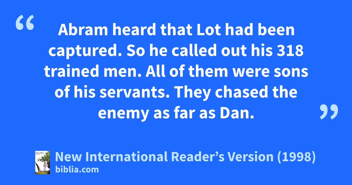 14Abram heard that Lot had been captured. So he called out his 318 trained men. All of them were sons of his servants. They chased the enemy as far as Dan. 15During the night Abram separated his men into groups. They attacked the enemy and drove them away. They chased them north of Damascus as far as Hobah.