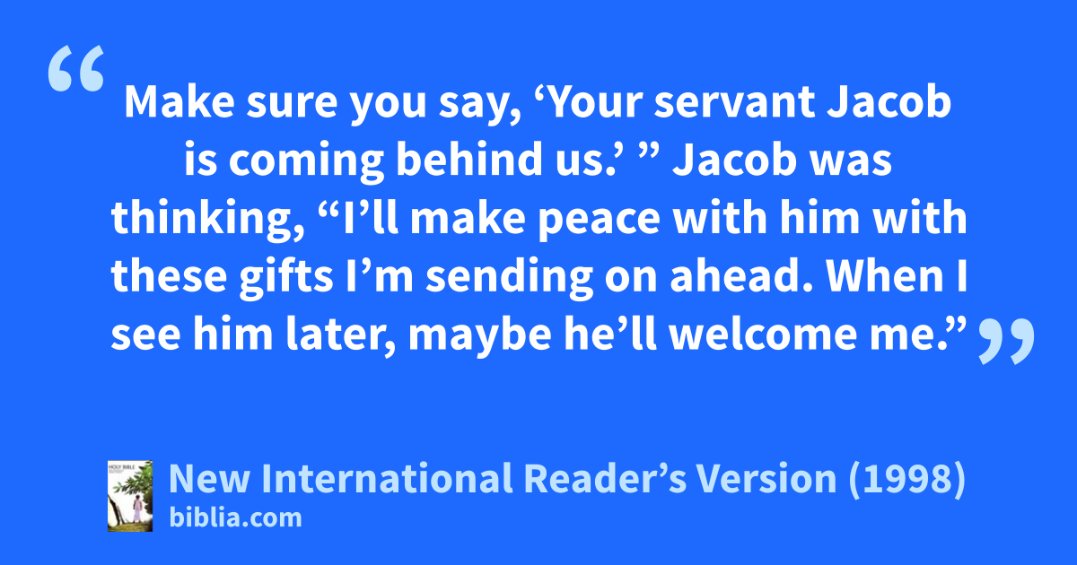 19He also spoke to the second and third servants. He told them and all of the others who followed the herds what to do. He said, “Say the same thing to Esau when you meet him. 20Make sure you say, ‘Your servant Jacob is coming behind us.’ ” Jacob was thinking, “I’ll make peace with him with these gifts I’m sending on ahead. When I see him later, maybe he’ll welcome me.”